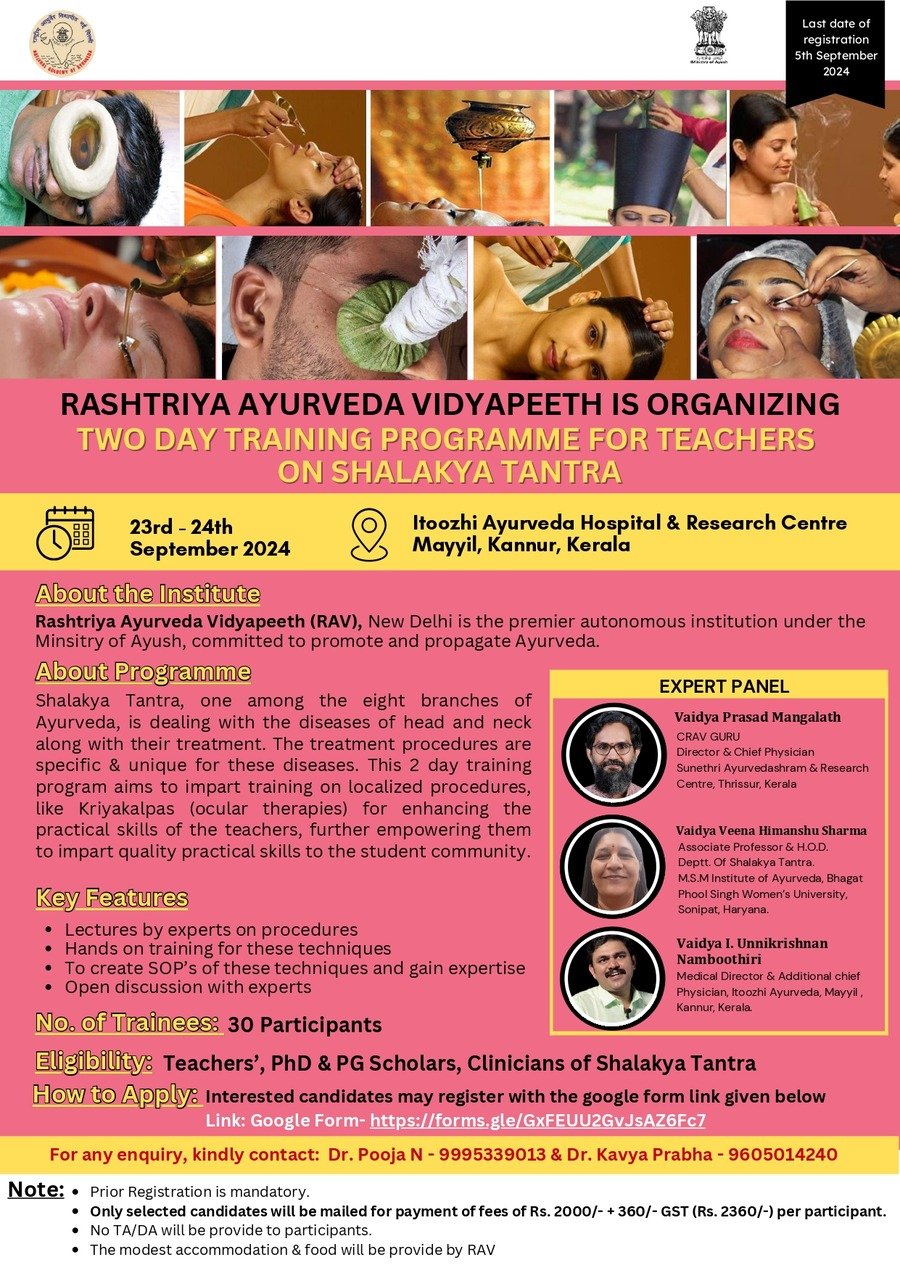 Rashtriya Ayurveda Vidyapeeth is organising a 2-day Training Program for Teachers on Shalakya Tantra at Itoozhi Ayurveda Hospital & Research Centre, Mayyil, Kannur Kerala.