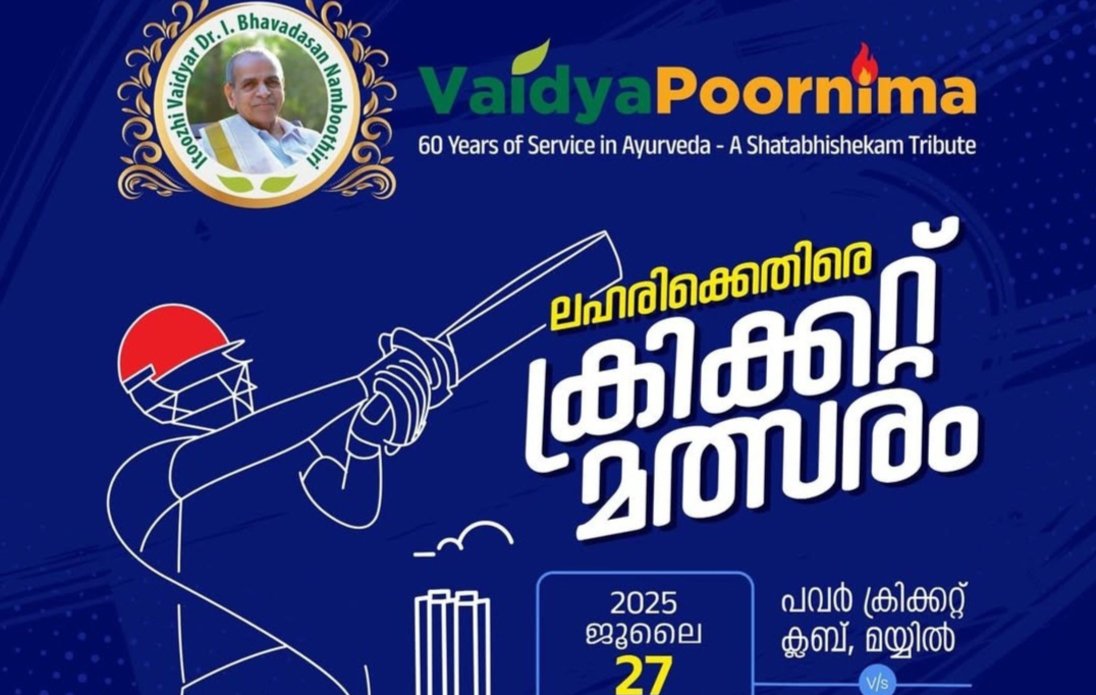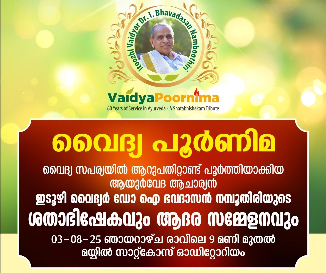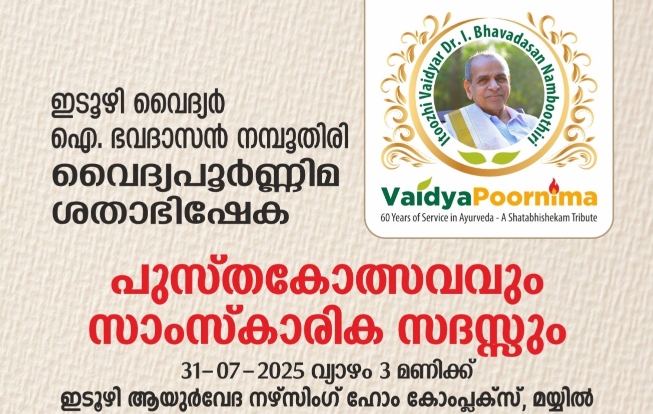 A Week-long series of Events to honour, felicitate and through it also raise awareness in better health and wellness through Ayurveda is underway, culminating in the grand Civic Felicitation by the People of Mayyil that will be held under the banner of “VaidyaPoornima” on Sunday at 9:00 AM at SATCOS Auditorium, Mayyil.